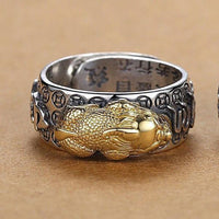 Encircling the Pixiu are intricately crafted silver-plated copper coins, each representing a form of currency and symbolizing wealth and prosperity. These coins are arranged in a pattern that not only enhances the ring's aesthetic appeal but also reinforces its auspicious energy.